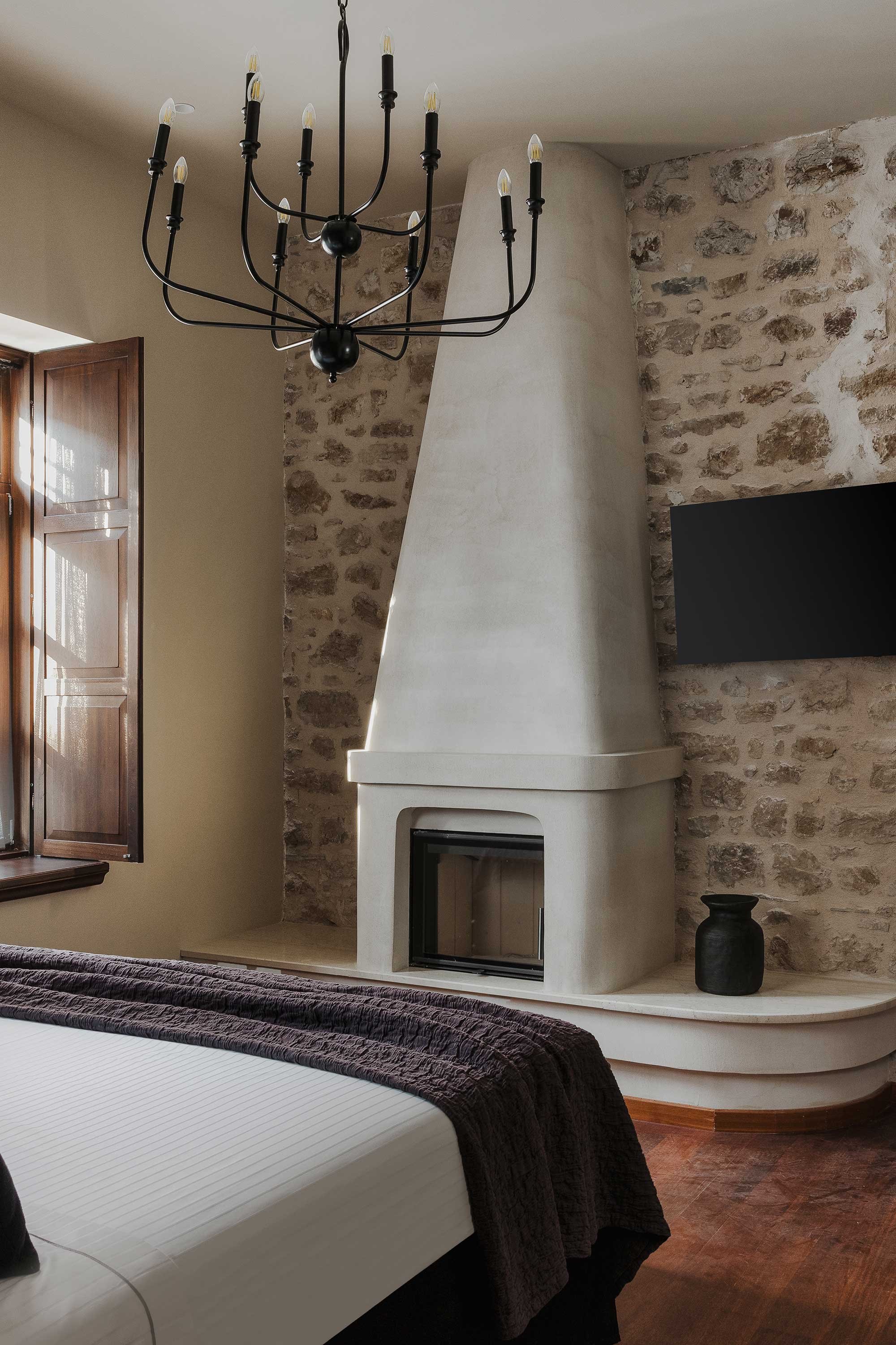 Ένα cozy δωμάτιο με μπανιέρα και τζάκι μέσα στον χώρο, για πιο χαλαρές και ζεστές στιγμές κατά τη διαμονή.